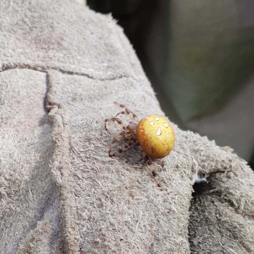 Colin’s interest in spiders led him to discover this Four-spotted orbweb spider, Araneus quadratus figure 15 (NB) photographed on Colin’s gardening gloves! Notice the banded legs and 4 spots on the body.